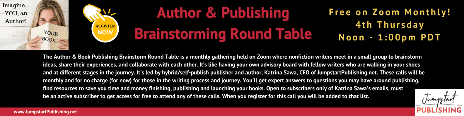 - Author Brainstorming Round Table – every 4th Thursday and this is FREE for now (so grab the opportunity now!) This a monthly gathering held on Zoom where nonfiction writers meet in a small group to brainstorm ideas, share their experiences, and collaborate with each other.It’s like having your own advisory board with fellow writers who are walking in your shoes and at different stages in the journey. ONLY FOR ACTIVE SUBSCRIBERS – SIGN UP NOW!