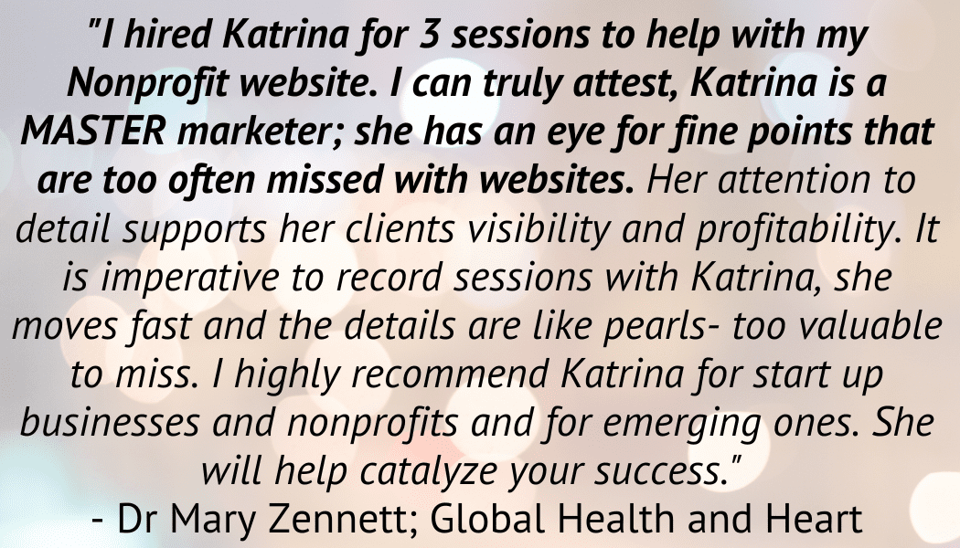 I only worked with Katrina for a short time to have her give me a jumpstart from where I was in my business. I realized I needed better marketing in place, more systems and possibly some new programs and offerings so that I could really amp up my revenues and in just three short months she helped me do all of that. Now I have a much more up-to-date marketing and business plan that I clearly understand what to do with and how to accomplish it. Oh and in that time I also attended two of her live events and they really were chock full of useful marketing and sales strategies that I’m also already implementing to get more higher paying clients.