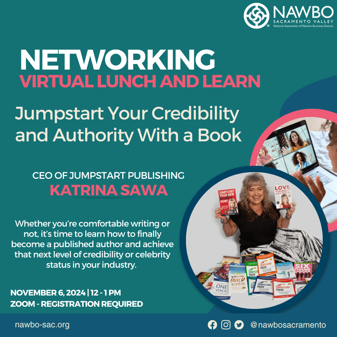 Virtual Lunch and Learn: Jumpstart Your Authority & Credibility with a Book Join me for an hour of connecting, learning, and inspiration November 6, 2024, as NAWBO Sacramento proudly presents our monthly Virtual Lunch & Learn. Come get connected with other...