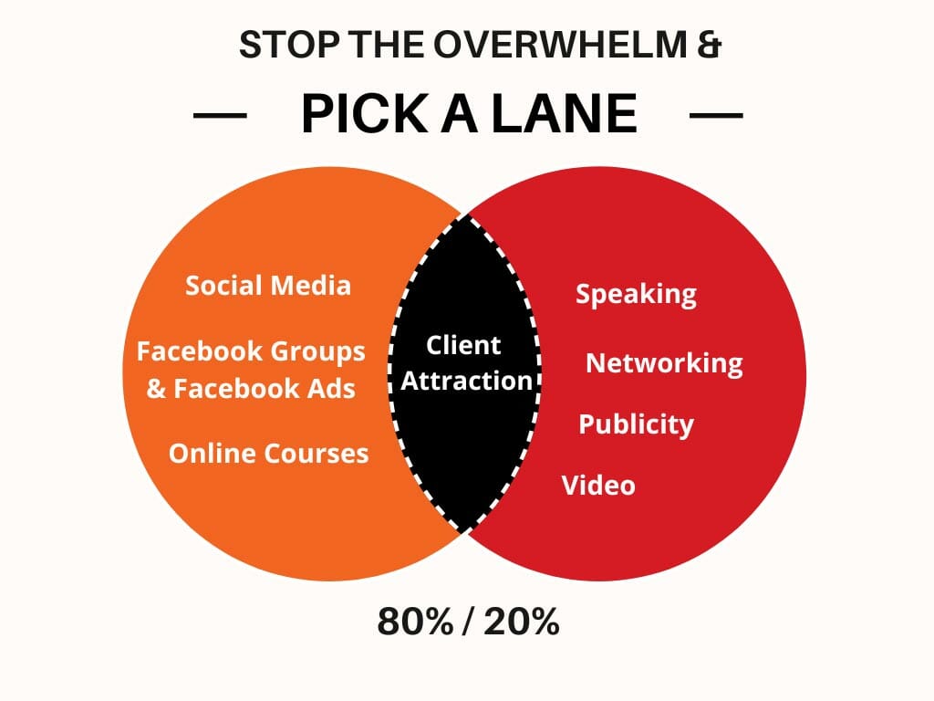 I’m not suggesting that you have to do only one or the other lane and that’s it. However, I do recommend perhaps simplifying your expectations on what you really need to do. And for the lane that you like the most, spend 80-90% of your marketing time there with 10-20% of your time in the other lane. That’s what I might suggest so you can stop pulling your hair out doing things you don’t like to do.