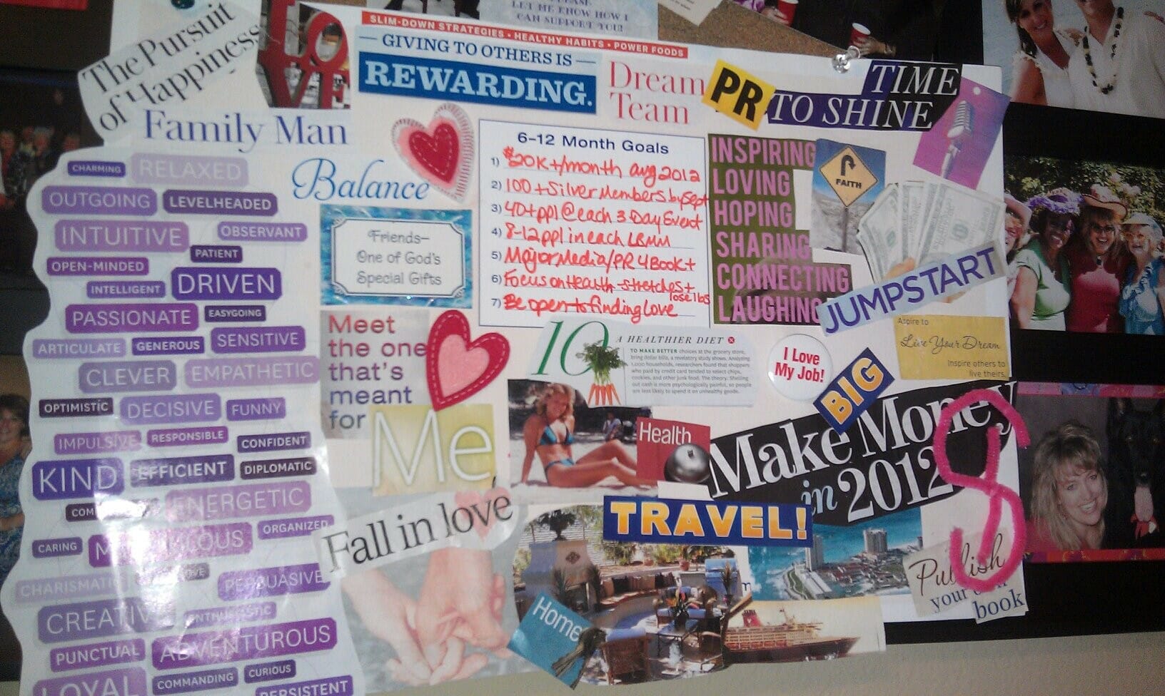 If you look at the board I did, I had love, family man and fall in love but all those purple traits were things I wanted in my man… I also wrote out a very detailed list of 53 things that I wanted in him and in “us” as a couple… I read those almost every day as well, sort of like how people read affirmations. That was my goal.